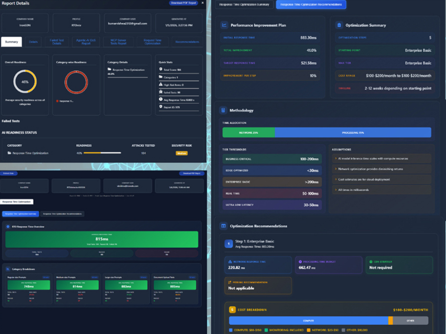 OptimalAI Testing evaluates AI deployments under real-world and extreme conditions, measuring response times, system behavior, and infrastructure limits. Based on these insights, the service delivers detailed, actionable optimization recommendations across compute, memory, instance sizing, networking, and quality-of-service layers—enabling organizations to continuously optimize AI performance as usage grows.